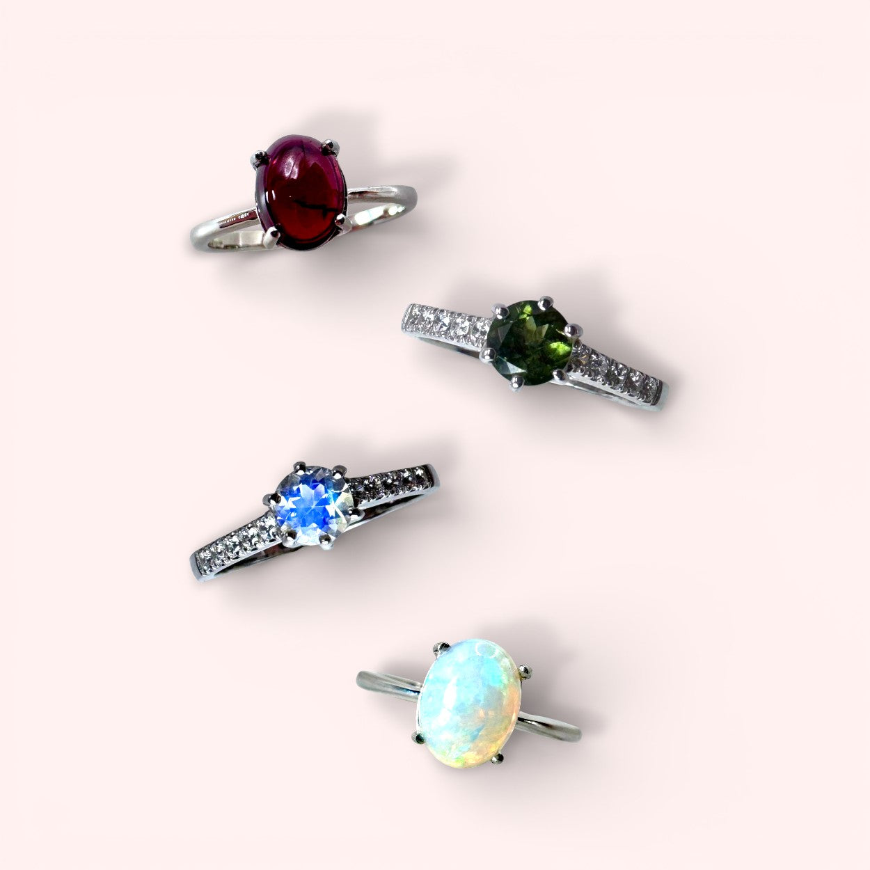 Chacune de nos créations est pensée comme un talisman. Que vous soyez attirée par la magie irisée de l'Opale, la douceur féminine de la Pierre de Lune ou la profondeur de la Topaze bleue, vous trouverez ici une pièce qui résonne avec votre histoire.